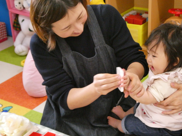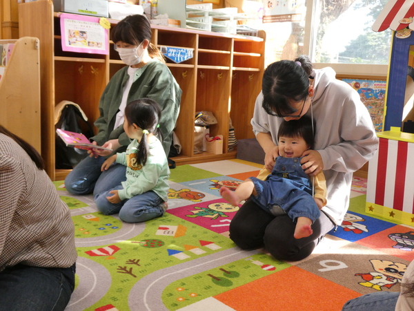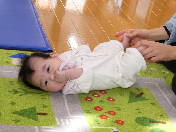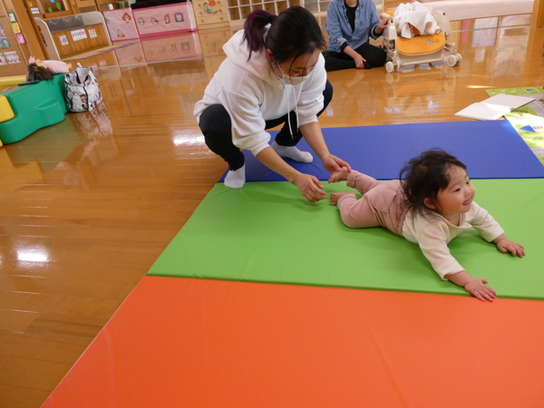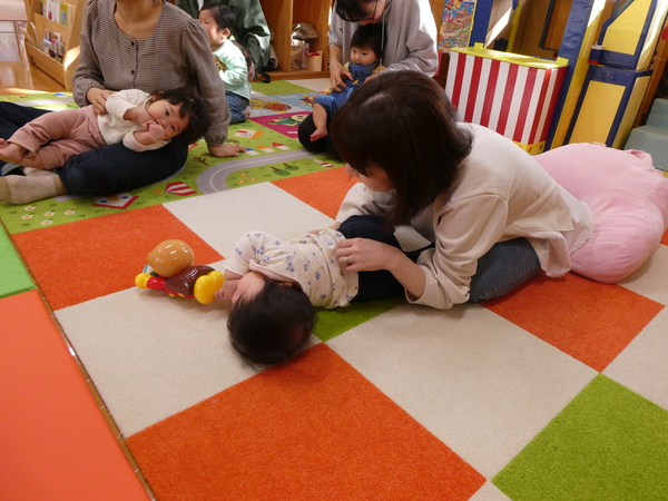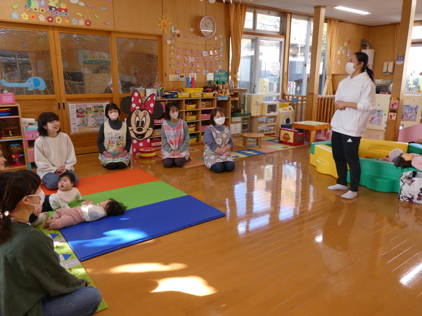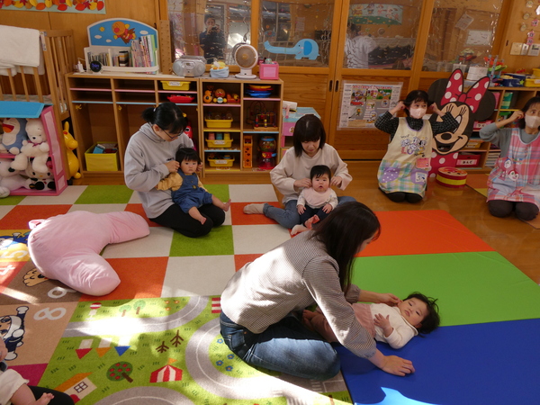 11月6日(木)子育て支援センター「にこにこ」で園の体操教室で来て頂いている齋藤真弓先生の「タッチセラピー」の講座があり、5組の親子が参加しました。マッサージや子どもと触れ合うことで幸せホルモンのオキシトシンが分泌され、信頼や愛情を深める効果や安心感を生みリラックスし、ストレスを軽減させる効果があることを学びました。腹部の腸の回りをマッサージし免疫を上げる方法や耳のマッサージをし自律神経を整えたり、優しく触れてあげることで安眠しやすくなる方法を実践を交えながら教えて頂きました。お母さんに気持ちよくマッサージをしてもらい笑顔で眠そうになるお友だちもいましたね💕ますます冬の感染症が心配なこれからの季節、マッサージでたくさんふれあい、免疫力を高めて感染症予防をしていきたいですね。