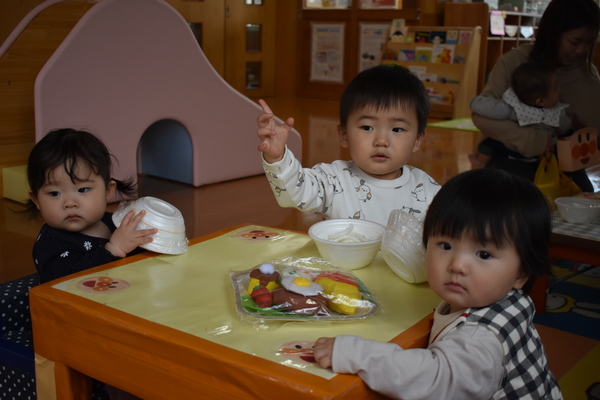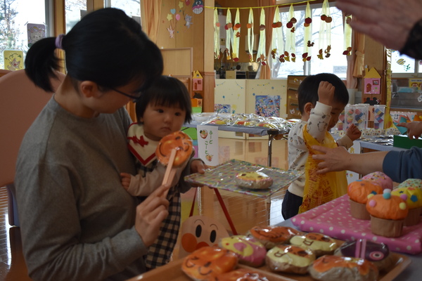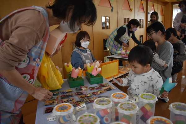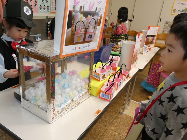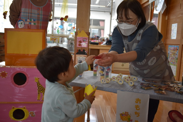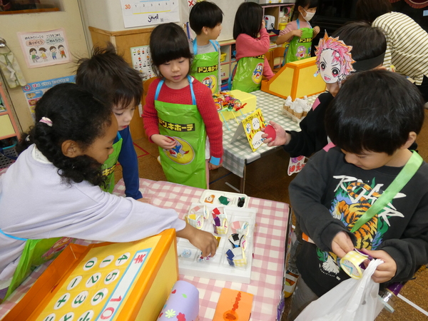 11月27日(木)未満児給食参観のミニ講座で時短家事コーディネーターの藤田ゆうみん氏による「時短クッキング」の講座に5名の支援センター利用の保護者も参加しました。参加した保護者からは「ポトフからカレーに作り変える調理や野菜の様々な切り方や保存する方法などを学び自宅でも試してみたい」との声も聞かれました。ミニ講座後、子育て支援センターの「遊びの講座」でお店屋さんごっこがあり、5組の親子が参加し「アンパンマンのパン屋さん」、「おもちゃ屋さん」や「フードコート」などでお買い物を楽しみました。お母さんと一緒に「どれにする?」と選んだり、アンパンマンの財布を持って張り切ってお買い物をし、保育者とお金のやりとりを楽しんでいるお友だちもいましたね。買った品物でごっこ遊びを楽しむかわいい姿もありました。「ペンギンマークの百貨店」のスケッチブックシアターは歌に合わせてノリノリでした♪