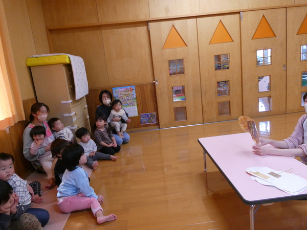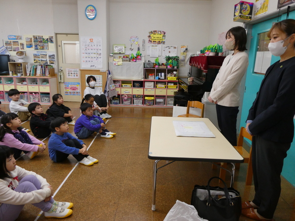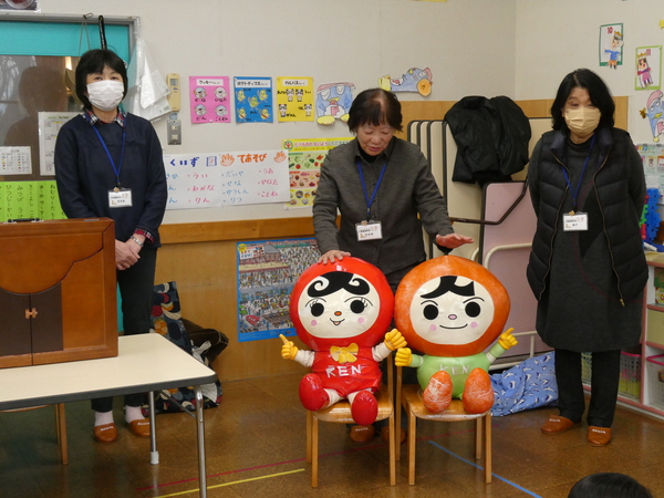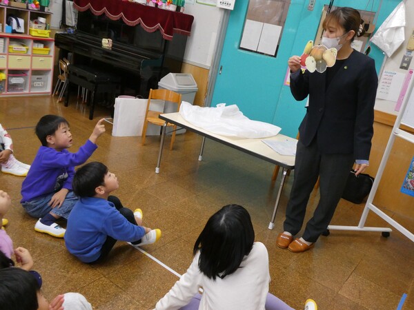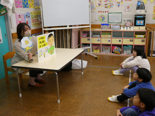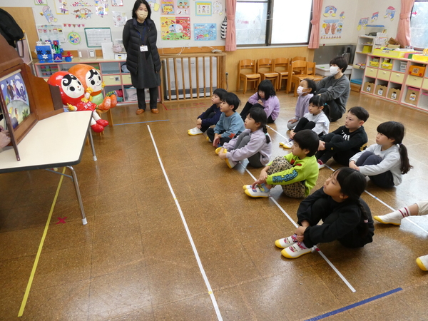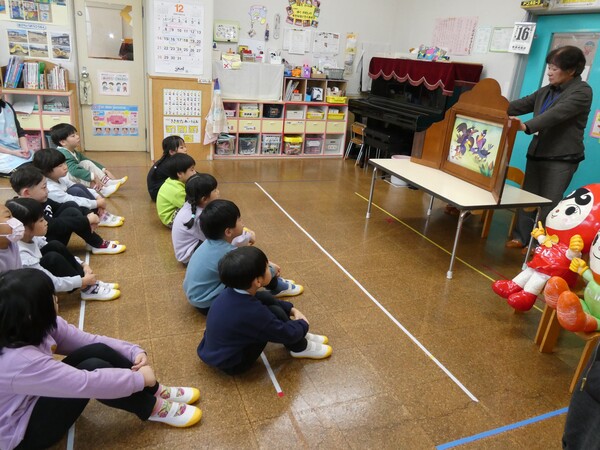 12月16日(火)にかほ市の「人権擁護委員会」の方々が来園し、きりん組(5歳児)に「ずっとともだちでいたいから」の紙芝居を見せてくれました。長いお話でしたが、真剣に紙芝居を見ていた子ども達でした。