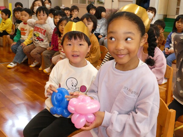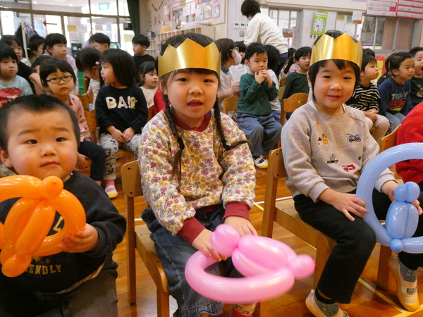 12月19日(金)は12月の誕生会でした。ステージに上がったお友だちはちょっぴり緊張気味でしたが、名前を呼ばれると元気に返事をしてくれました!今月の園長先生のバルーンアートは「小鳥🐥」でした🎁