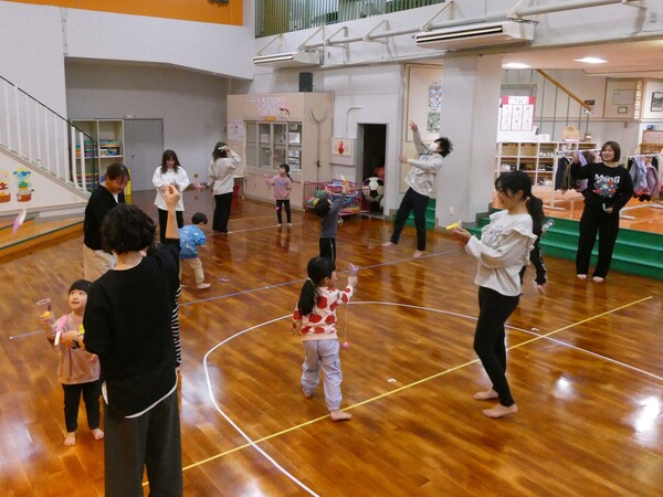 11月7日(金)は5歳児きりん組、13日(木)は4歳児こあら組、20日(木)3歳児うさぎ組の“のびのびキッズ&給食参観”でした。のびのびキッズは講師の齋藤真弓氏の指導のもと親子でふれあい遊びやおもちゃ作りを楽しみました。