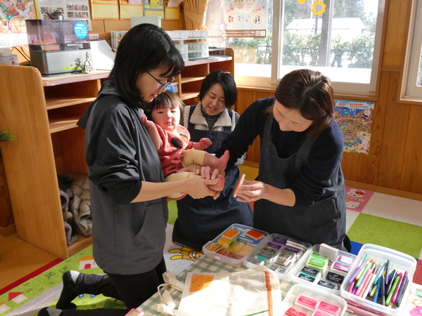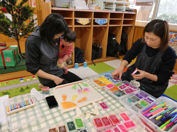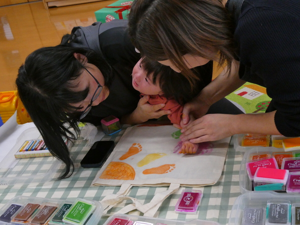 12月4日(木)「はんことクレヨンⅾeバッグ作り」の講座(由利本荘市子育て支援団体「ままちょこ」 菅原 清香さん)2組の親子が参加し、無地のトートバッグに手形や足型を押し、布用のクレヨンやペンでイラストを描き、手形足形アートのかわいい手作りバッグの作り方を教えて頂きました。子どもの足形でたくさんの動物を描いたバッグや親子の手形で親子像を表現したバッグなど親子の共同製作で心温まる手作りバッグが完成しました💕参加した保護者からは「数年後子どもが成長した時に手足の大きさを比べることが楽しみです。」「成長の記録にもなり、良い記念となりました。」など喜ぶ声が聞かれました。楽しいひと時になりました♪