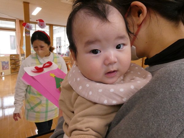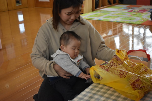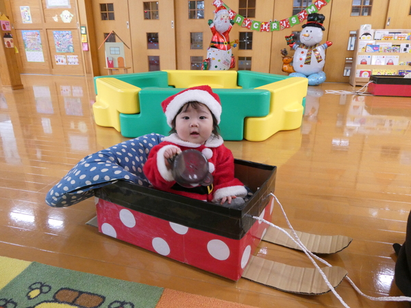 12月18日(木)は子育て支援センターの「遊びの講座」がありました。3組の親子が参加し「クリスマスプレゼント運びゲーム」や「クリスマス手遊び」、「サンタのおもちゃ工場やシルエットクイズのパネルシアター」などで盛り上がり、クリスマスパーティーを楽しみました。お母さんトナカイ、子どもサンタで協力してプレゼントを届けるゲームではソリを引っ張りながら「大きくなって重くなったね」と成長を感じながら参加をしていました。サンタさんからのプレゼントにも喜んでいました🎵みんなでメリークリスマス🎄⭐