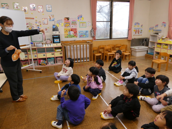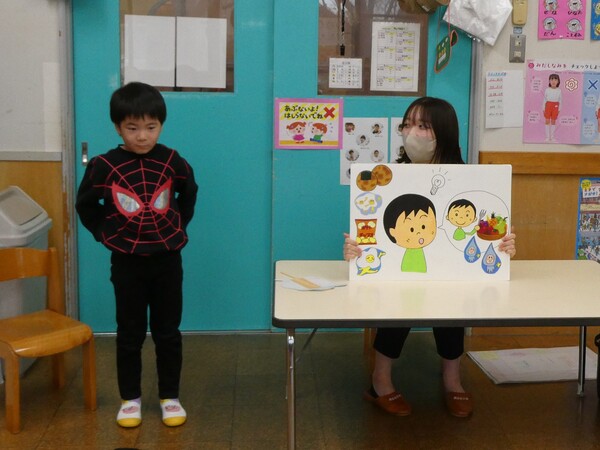 12月3日(水)は秋田県栄養士会から栄養士2名が来園し、年長児を対象とした“栄養出前講座”を行いました。栄養士さんが読んでくれた『ようこちゃんとやさいたち』『いらない“おしお(塩)”にば〜いばい』という2つの紙芝居を見る子どもたちの表情は真剣!!読んだ後に問題が出されると「はい!」と元気に答えていましたよ✨その後は“お野菜クイズ”に挑戦🥕栄養士さんのヒントをよく聞いて答え、正解すると大喜びでした🤗“栄養出前講座”を通して『食』への興味や関心が高まり、『食』に対する正しい知識を学ぶ機会になったようです。