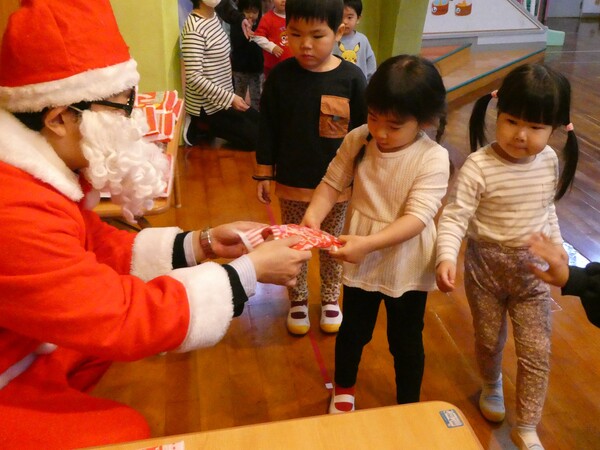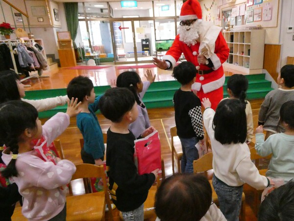 誕生会の後は、クリスマスパーティー🎄みんなで「きよしこのよる」を歌ってから、園長先生からクリスマスについて大型紙芝居「クリスマスってなに?」を見ながら、お話がありました。きりん組(5歳児)の催し物「手遊び」「シルエットクイズ」「ダンス」を披露し、クリスマスムードを盛り上げてくれました。サンタさんが登場すると、目を輝かせ「トナカイはどこにいるの?」「サンタさんは、英語を話せるの?」と質問したり、プレゼントをもらったり大興奮の子どもたちでした‼「経友会」の皆様より、クリスマスケーキを園児一人一人に頂きました。楽しいクリスマスパーティーになったね♪