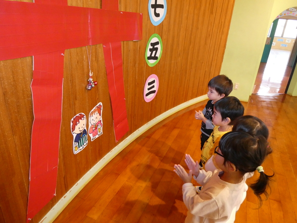 催し物は『七五三』例年だと近くの金浦山神社に参拝に行っていましたが、熊の出没情報に配慮し今年度はステージに作った勢至保育園神社にみんなで参拝しました。みんな元気に大きくなりますように✨その後…以上児クラスは“色水マジック”未満児クラスが“森のお風呂”のパネルシアターを見て楽しみました🤗